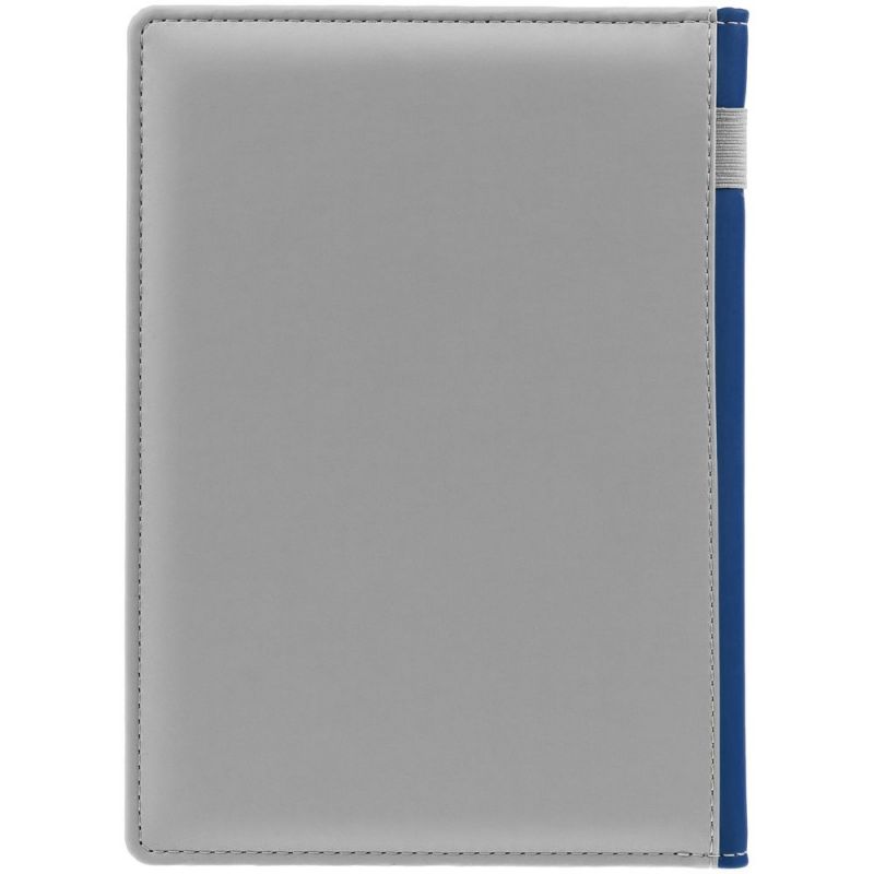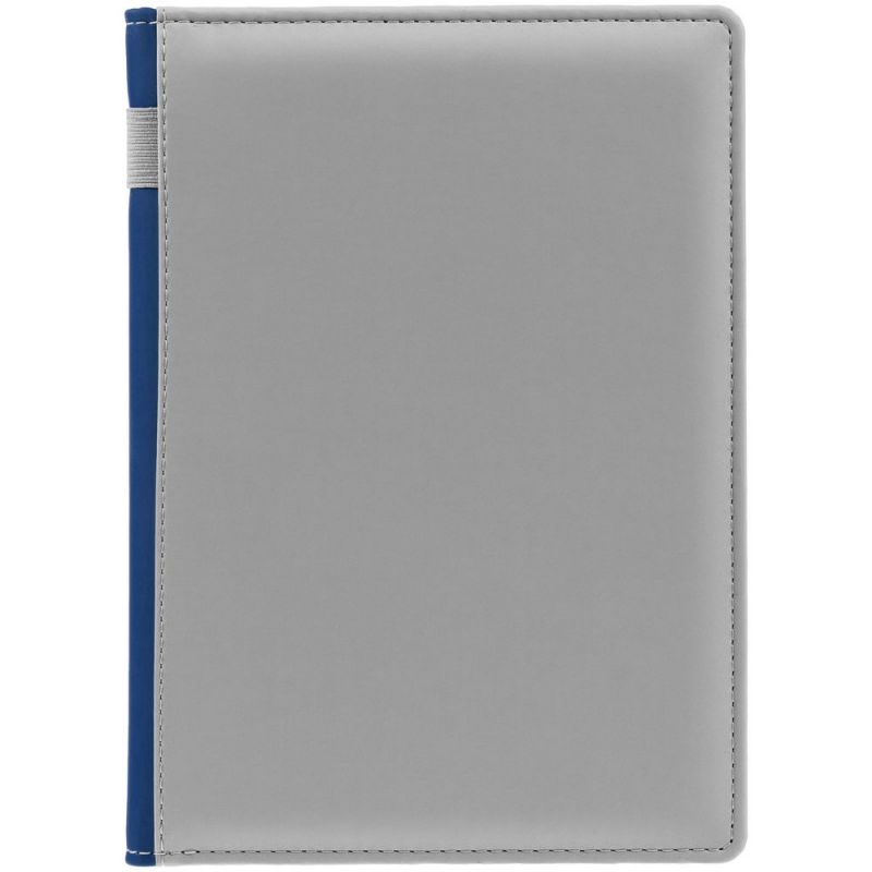 Твердая обложка с поролоном, материал обложки — Soft Touch, серый СС и Soft Touch Ultra, синий НН. На корешке ежедневника находится петля из резинки.