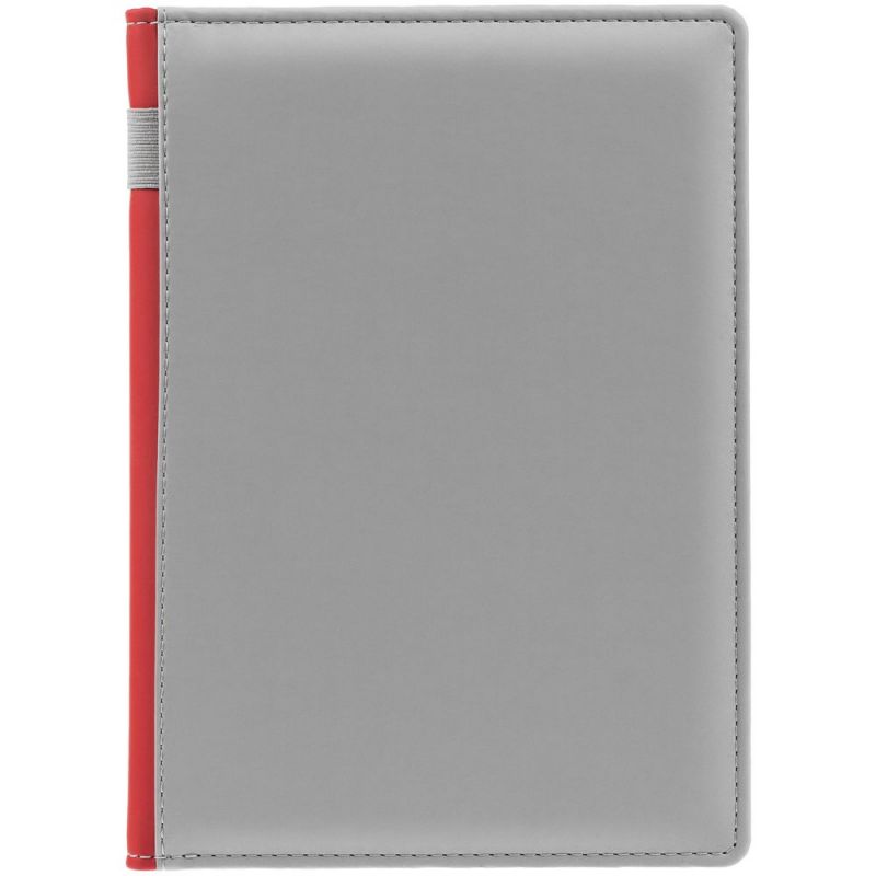 Твердая обложка с поролоном, материал обложки — Soft Touch, серый СС и Soft Touch Ultra, красный PP. На корешке ежедневника находится петля из резинки.