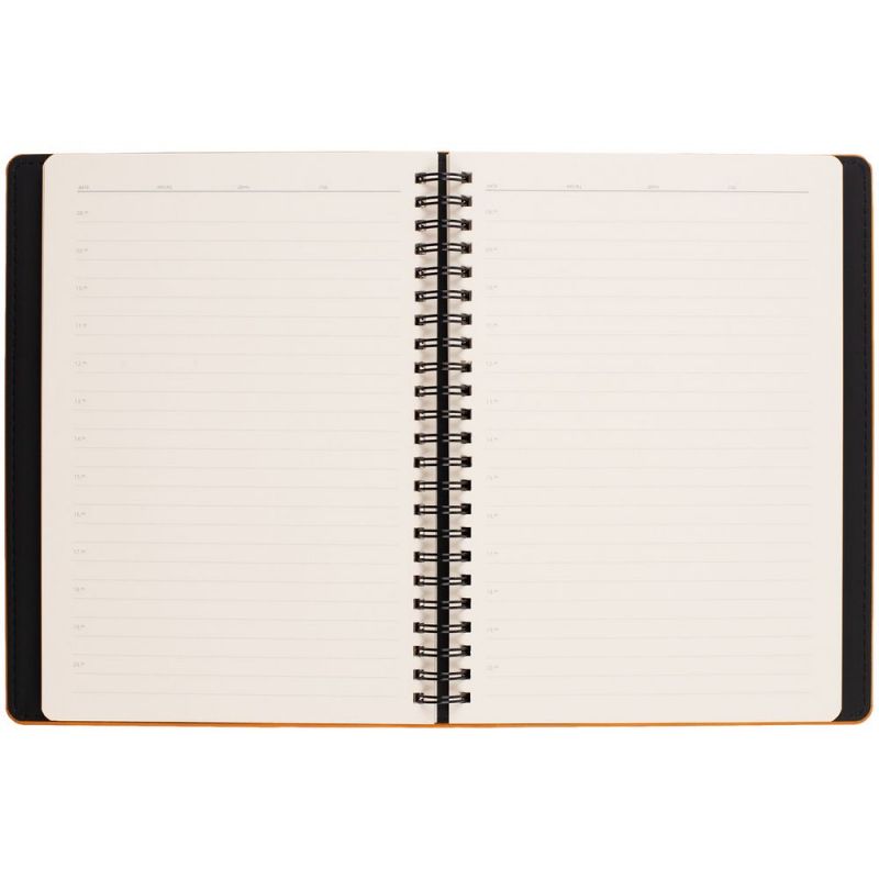 Ежедневник с блоком на пружине в твердой обложке, выполнен из материалов Nubuk Touch, оранжевый ОО и Soft Touch, черный AA.