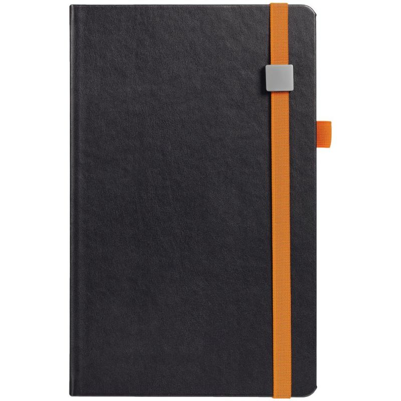 Ежедневник с полутвердой обложкой, выполнен из материала Waltz, черный АА, дополнен оранжевой резинкой с металлическим шильдом и ляссе.
