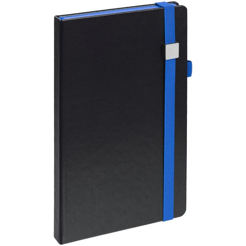 Ежедневник с полутвердой обложкой, выполнен из материала Waltz, черный АА, дополнен синей резинкой с металлическим шильдом и ляссе.