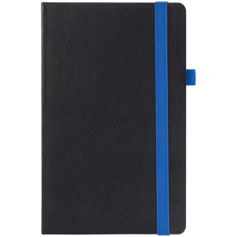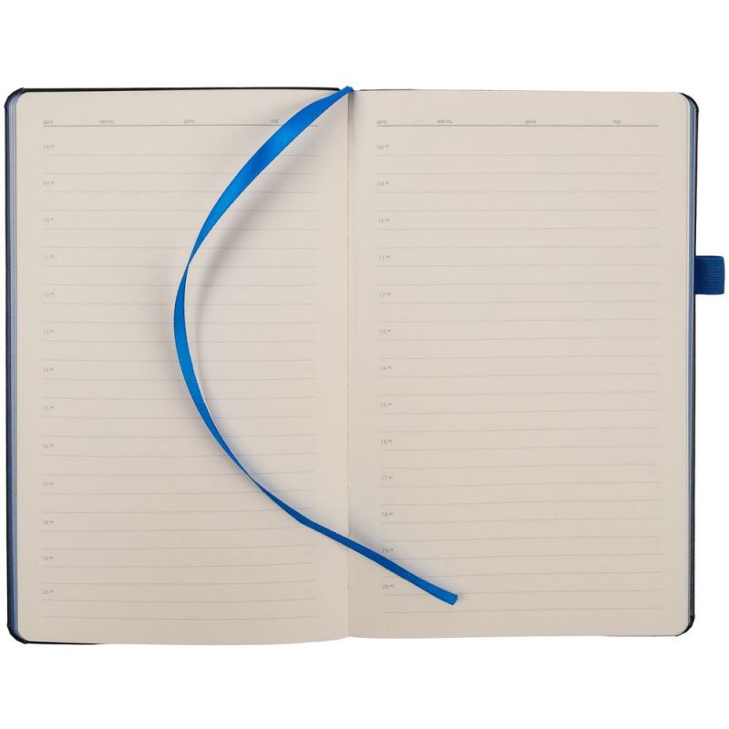 Ежедневник с твердой обложкой, выполнен из материала Waltz, черный АА, дополнен синей резинкой и ляссе.