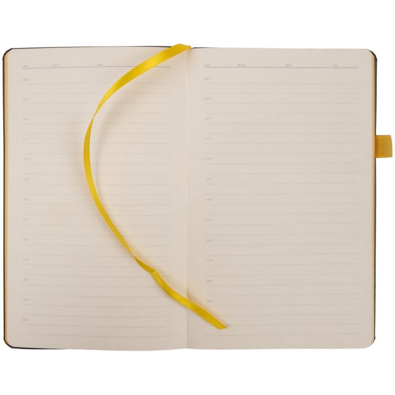 Ежедневник с твердой обложкой, выполнен из материала Waltz, черный АА, дополнен желтой резинкой и ляссе.