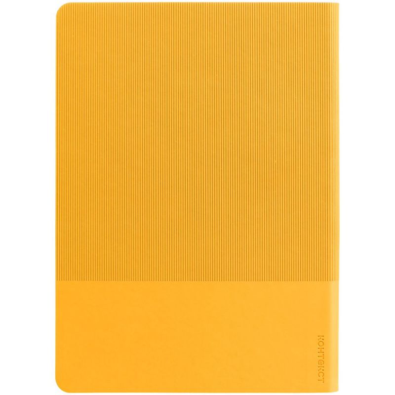 Ежедневник с гибкой обложкой выполнен из материала Soft Touch, желтый KK и Latte, желтый (внутренний материал); дополнен ляссе желтого цвета и фактурным тиснением обложки.