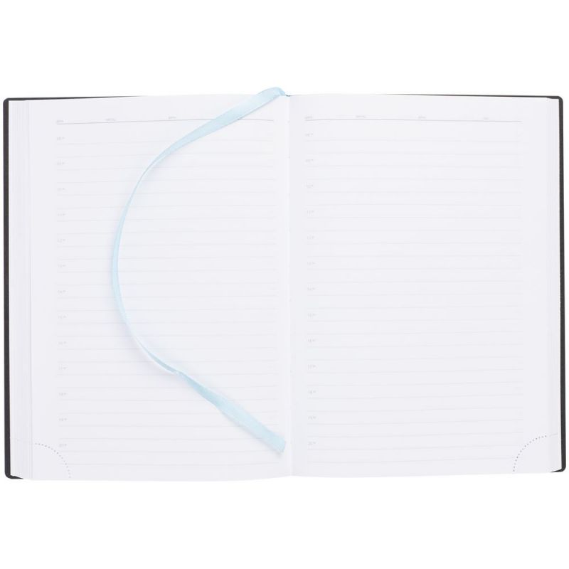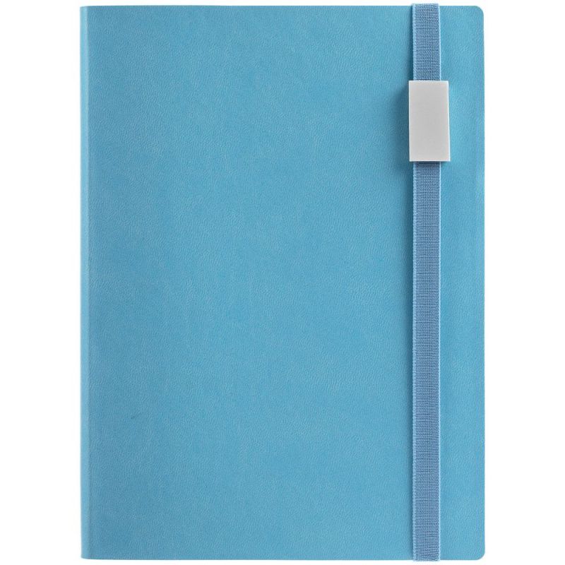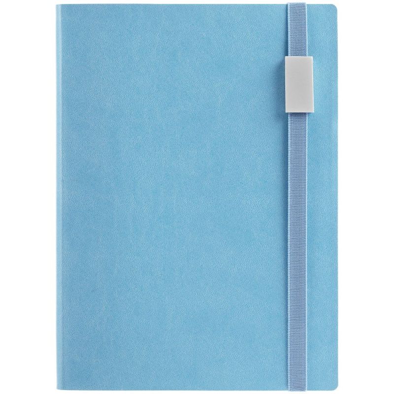 Ежедневник с гибкой обложкой, выполнен из материала Latte, голубой JJ, дополнен резинкой шириной 1 см с металлическим шильдом, капталом и ляссе голубого цвета.