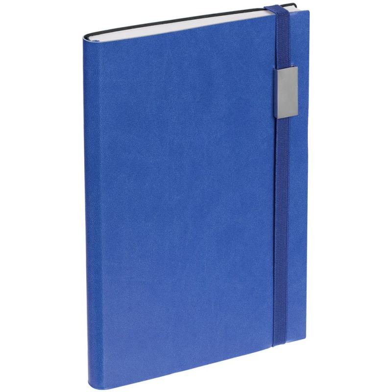 Ежедневник с гибкой обложкой, выполнен из материала Latte, синий НН, дополнен резинкой шириной 1 см с металлическим шильдом, капталом и ляссе синего цвета.