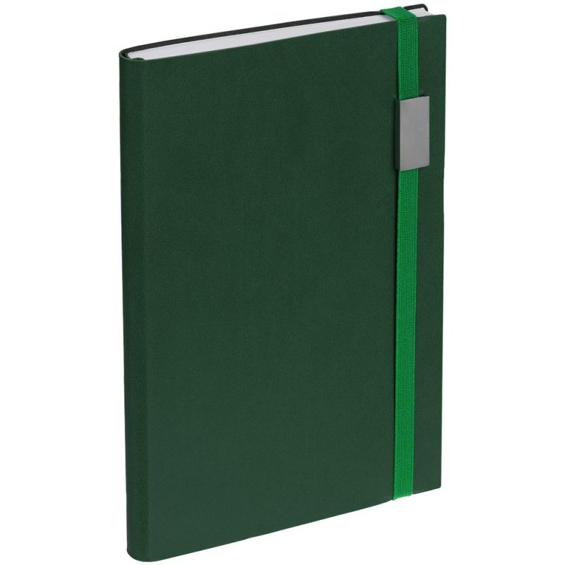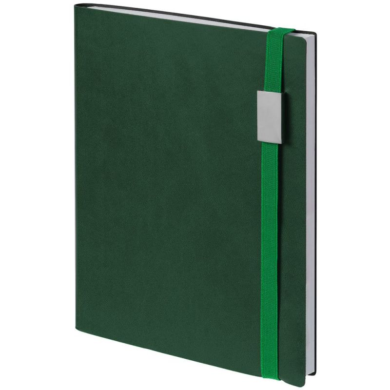 Ежедневник с гибкой обложкой, выполнен из материала Latte, зеленый FF, дополнен резинкой шириной 1 см с металлическим шильдом, капталом и ляссе зеленого цвета.