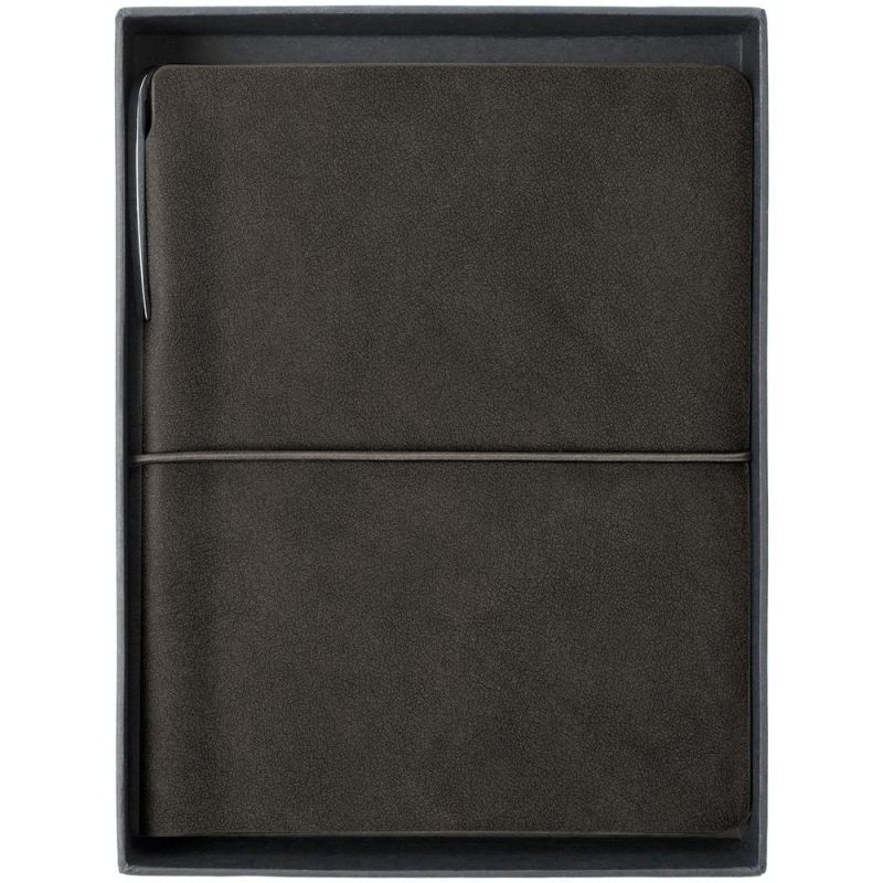 Ежедневник из искусственного материала, напоминающего замшу, и ручка с покрытием софт-тач, которая удобно прячется за обложку ежедневника.