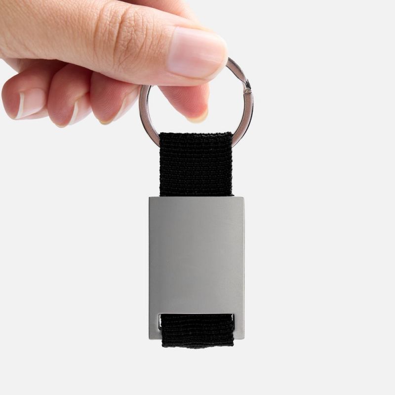 Минималистичный металлический брелок с тканевой вставкой.