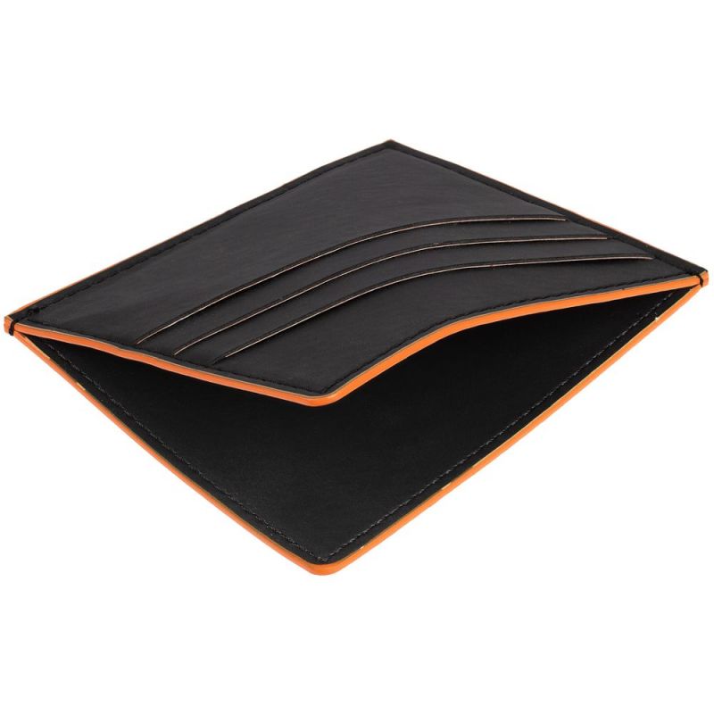 Чехол выполнен из материала Soft Touch Pearl, черный АА, дополнен окрашенным срезом края и внутренним карманом из цветного картона. Имеет 4 отделения для кредитных карт и 1 отделение для купюр.