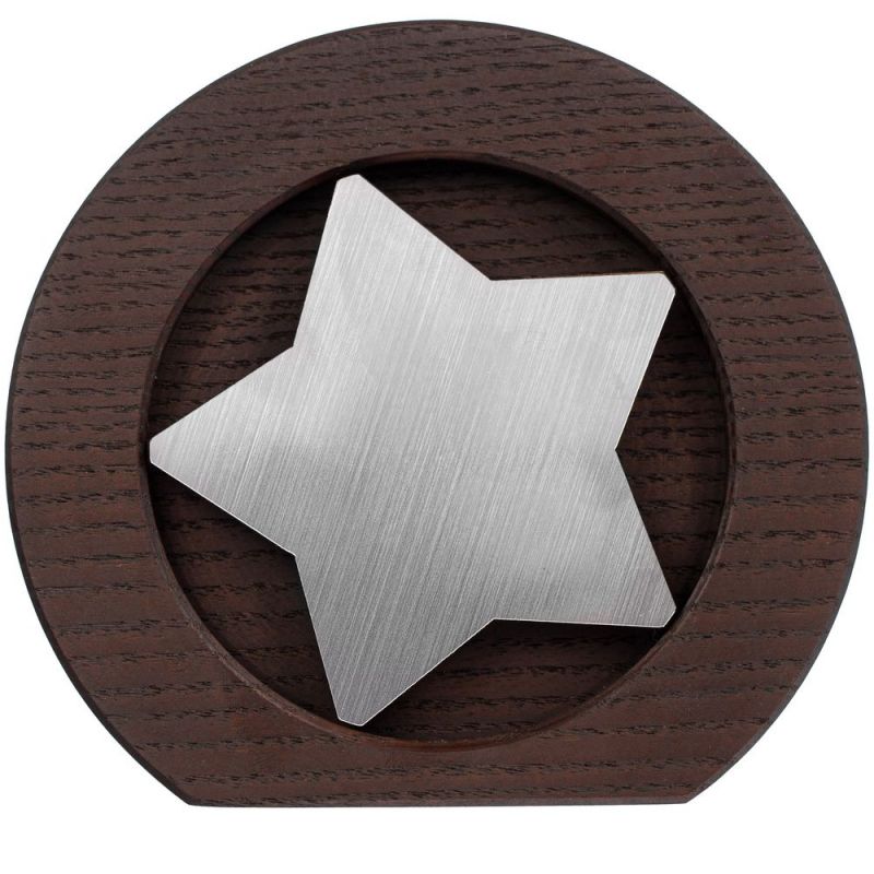 Вставка со звездой из зеркального пластика на деревянной основе крепится на приподнятое основание внутри стелы, что создает объем и многослойность награды. На вставке предусмотрен клеевой слой для крепления после нанесения.