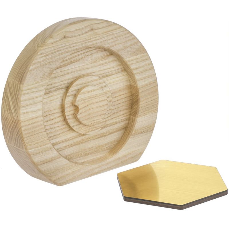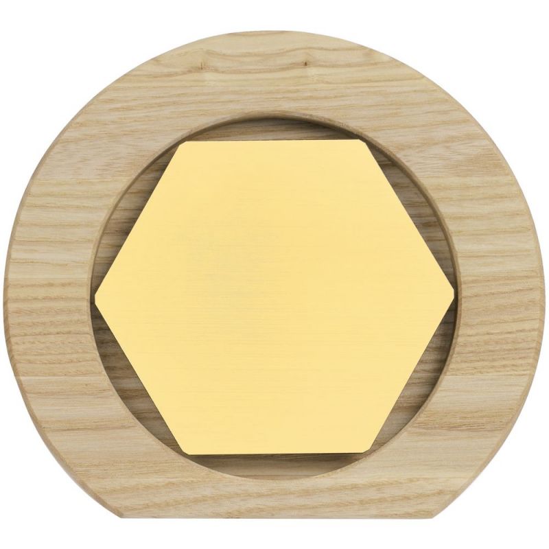 Вставка с шестигранником из зеркального пластика на деревянной основе крепится на приподнятое основание внутри стелы, что создает объем и многослойность награды. На вставке предусмотрен клеевой слой для крепления после нанесения.