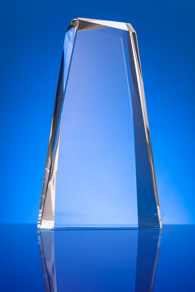 Стела изготовлена из стекла К9, в основе которого лежит оптическое боросиликатное стекло. Эту марку стекла отличает низкий процент посторонних включений, высокий показатель преломления и высокая прозрачность — идеальные качества для изготовления наград премиального уровня.