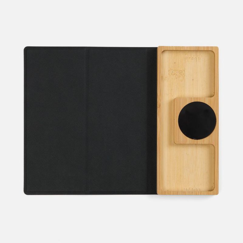 Midstream — это коврик для мышки с площадкой для беспроводной зарядки и отсеком для канцелярских принадлежностей. Его можно использовать как на работе, так и в дороге или на встречах: коврик компактно складывается и не занимает много места в сумке для ноутбука.