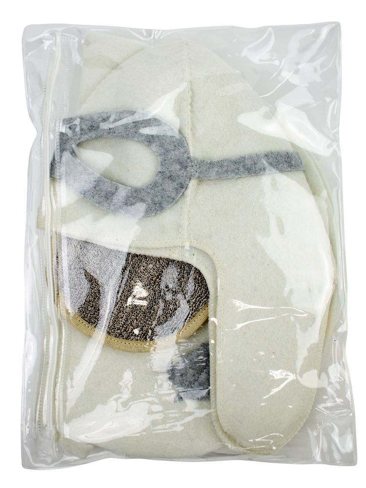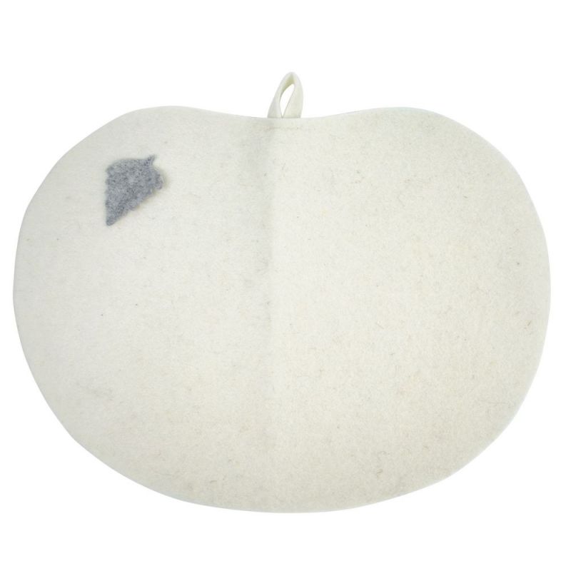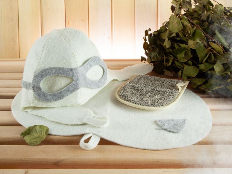 Шапка и коврик изготовлены из шерстяного войлока высокой плотности, который обеспечивает идеальную защиту от высокой температуры в бане и сауне. Одна сторона мочалки выполнена из сизаля, она жесткая и отлично массирует и скрабирует кожу, другая — из махровой ткани — более мягкая и легко взбивает мыло в пышную пену.
