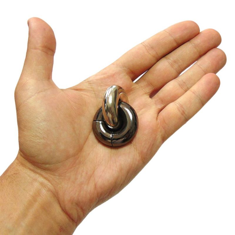 Красивая металлическая головоломка Donuts похожа на два соединенных между собой пончика. Необходимо отделить один от другого, а потом снова соединить их вместе.