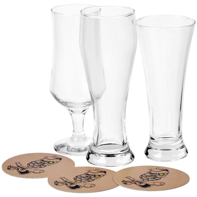 Три бокала разных форм, чтобы максимально раскрыть особенности выбранных сортов пива, костеры с брутальным принтом — свистать всех наверх и пусть пива будет целое море!