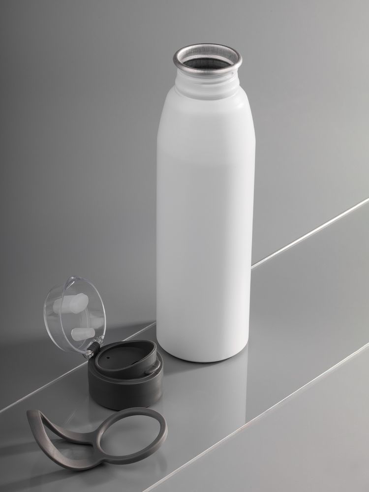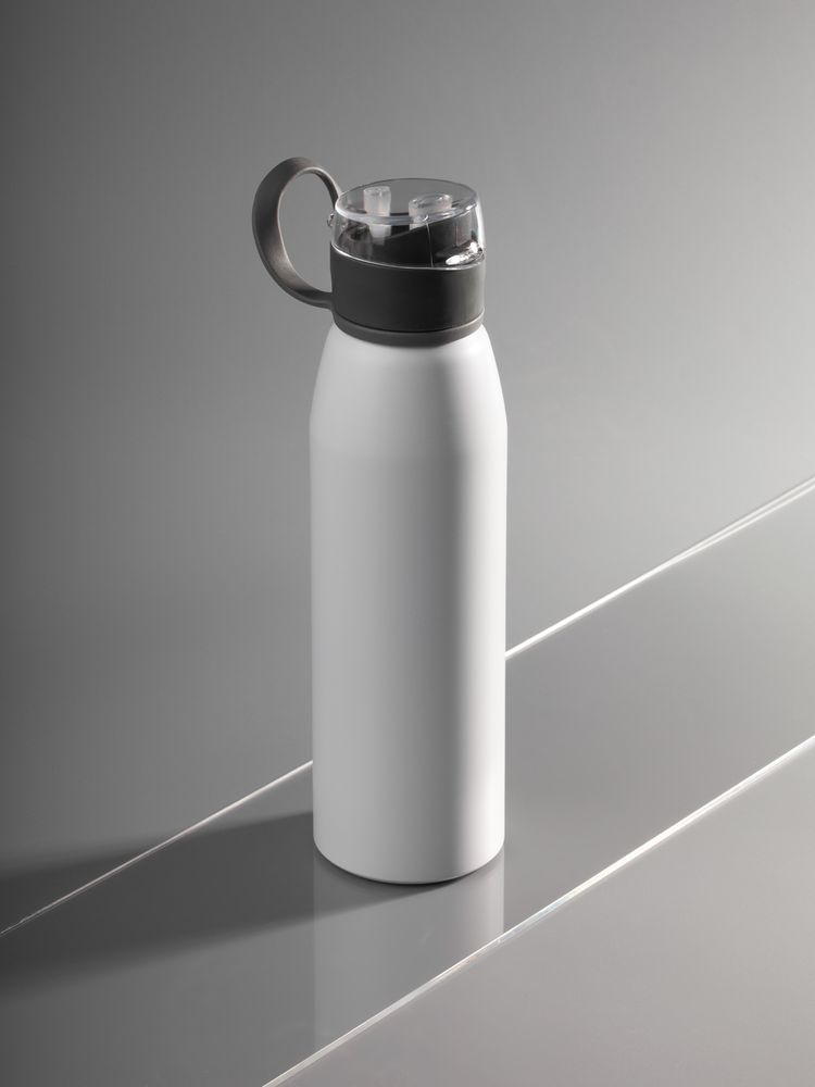 Легкая бутылка для спорта с откидной крышкой и силиконовой петлей для удобной транспортировки.