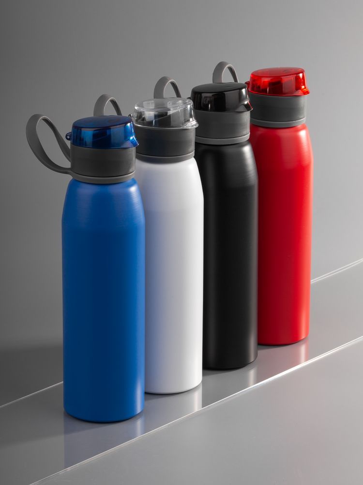 Легкая бутылка для спорта с откидной крышкой и силиконовой петлей для удобной транспортировки.