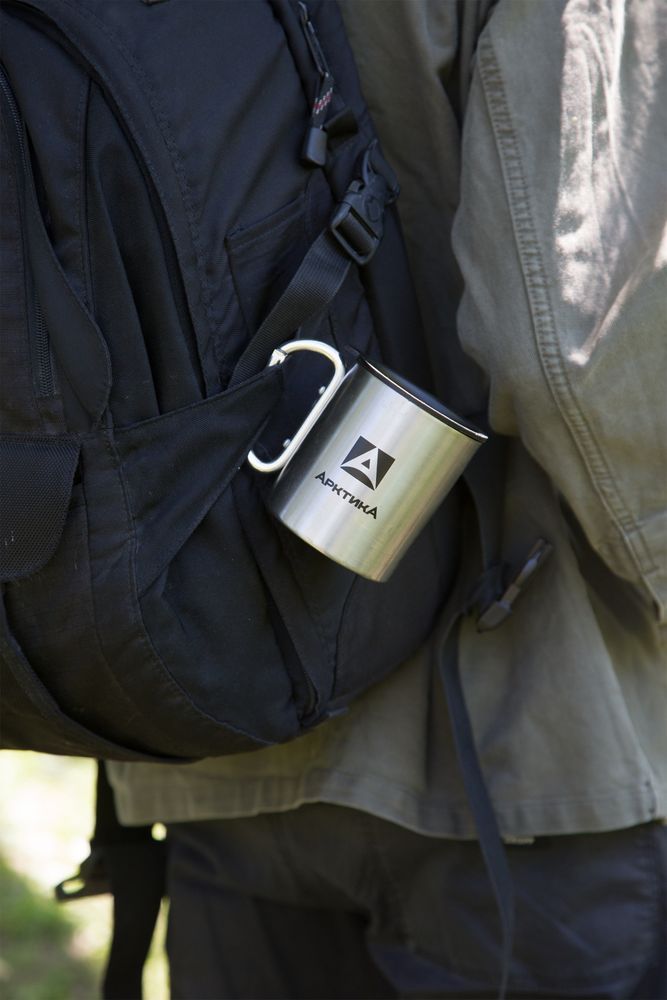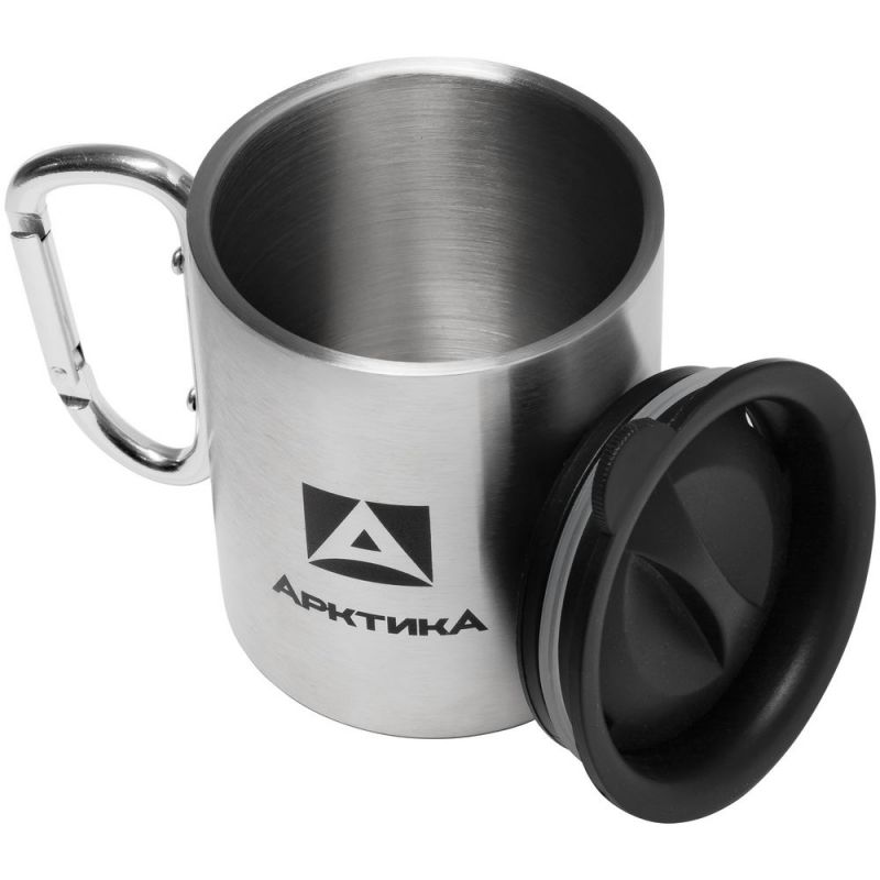 Компактная и легкая термокружка из полированной нержавеющей стали с крышкой и ручкой-карабином.