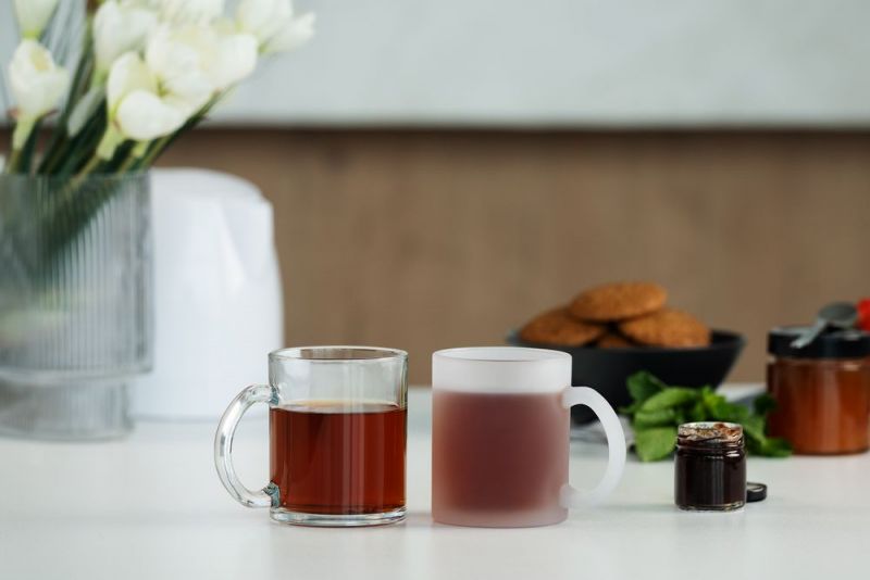 Стеклянная кружка классической формы с удобной ручкой. Подходит для сублимационной печати.