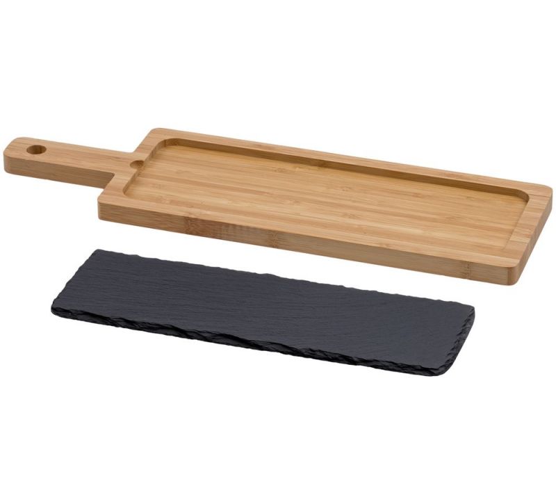Сервировочная доска из бамбука со сланцевой вставкой может использоваться для оригинальной подачи сыра, хлеба и любых других закусок. За сланцевой посудой легко ухаживать, она не подвержена распространению грибка и бактерий. Перед первым применением доску следует помыть с использованием моющих средств.