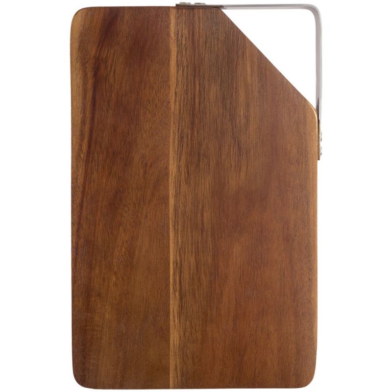Качественная разделочная доска — необходимый предмет на любой кухне. Доска выполнена из прочного материала — древесины акации. Она обладает высокой твердостью, водоотталкивающими свойствами. Для удобства размещения на стене в верхнем углу предусмотрен подвес из металла.Доска поставляется в пакете.