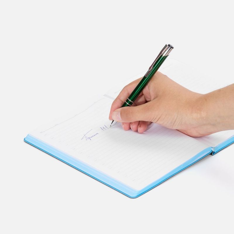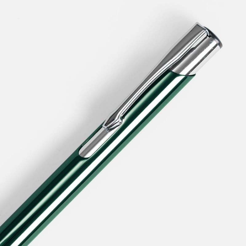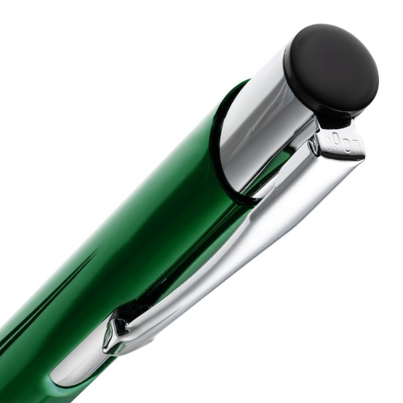Яркая шариковая ручка с глянцевым цветным корпусом и хромированными деталями.