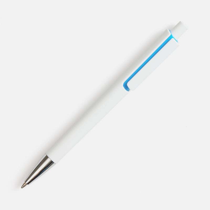 Шариковая ручка с глянцевым белым корпусом и цветовым акцентом у клипа, который дополнит логотип компании.