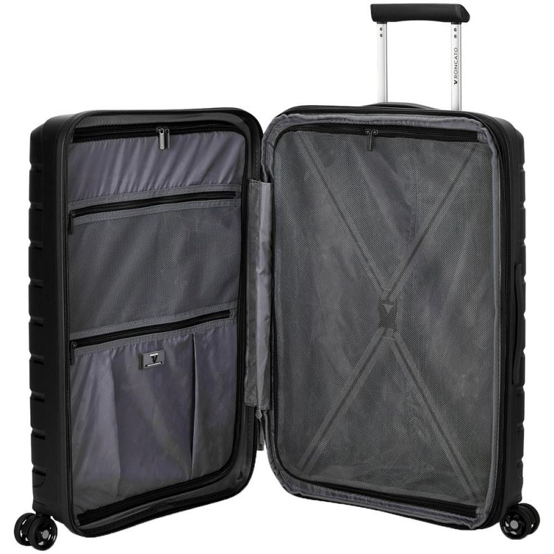 - Чемодан с 2 отделениями: одно отделение с сетчатым разделителем и прижимными ремнями, а второе оснащено перегородкой на молнии с двумя карманами