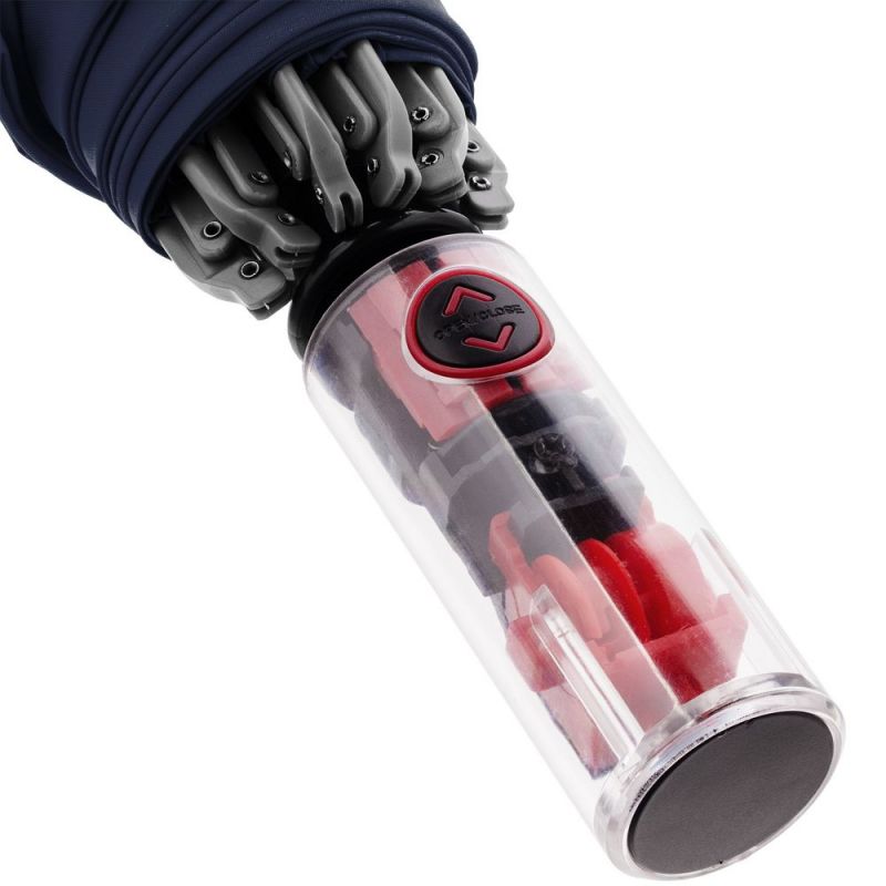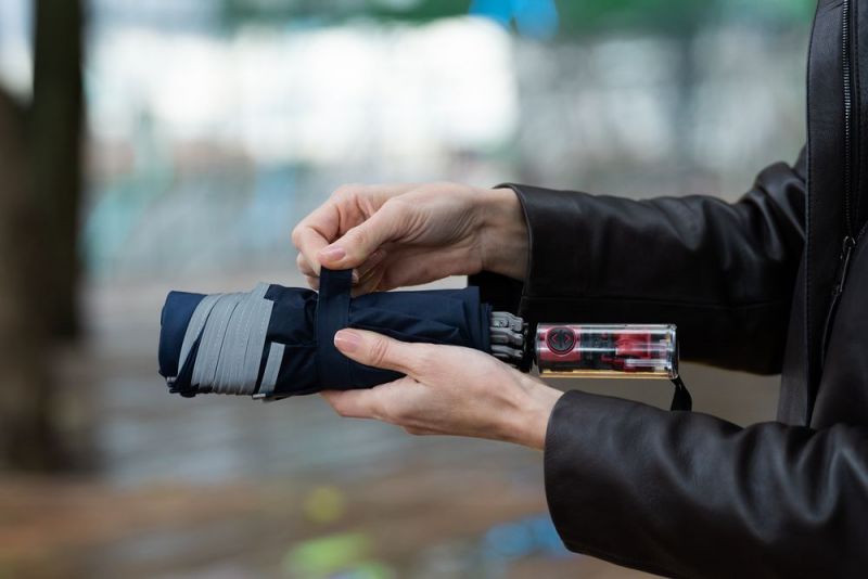 Складной зонт Futurum привлекает внимание оригинальным дизайном. Складываясь после дождя, он прячет мокрую поверхность в себя, а сухая остается снаружи. Светоотражающий кант и ручка из прозрачного пластика, не скрывающая ярких деталей внутри, добавляют внешнему виду зонта футуристичности.