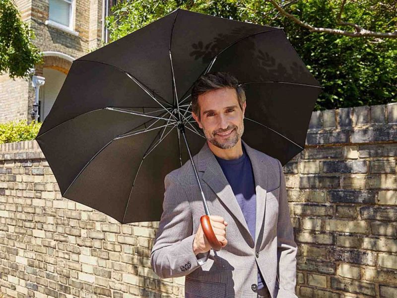 Идеальная модель для тех, кто не задается целью найти легкий и короткий складной зонт-«механику», а скорее, обрадуется старому доброму увесистому и основательному полуавтомату. У модели ветроустойчивая конструкция. Рукоять выполнена из массива дерева и благодаря натуральности материала невероятно комфортно ощущается в руке.