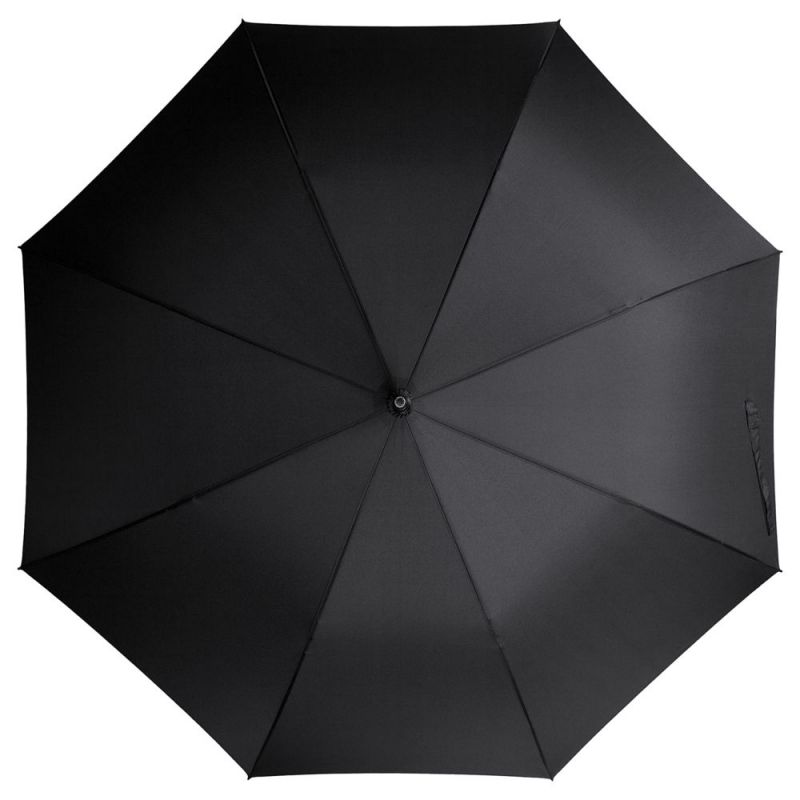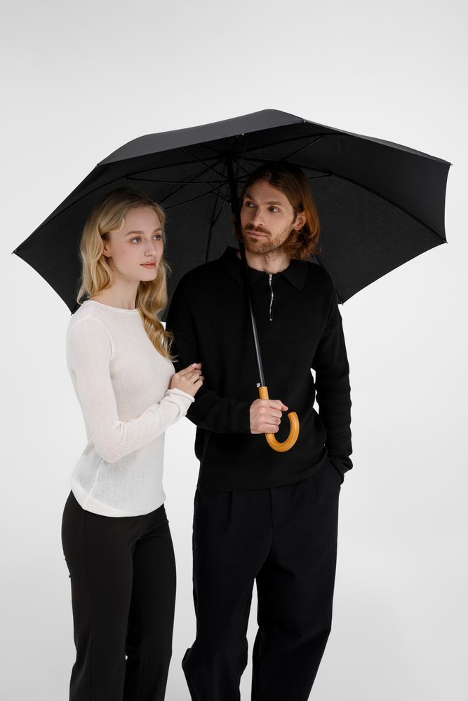Элегантный зонт с большим куполом и деревянной J-образной ручкой.