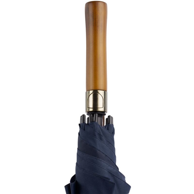 - Прямая деревянная ручка с петлей из натуральной кожи и кнопкой открытия зонта