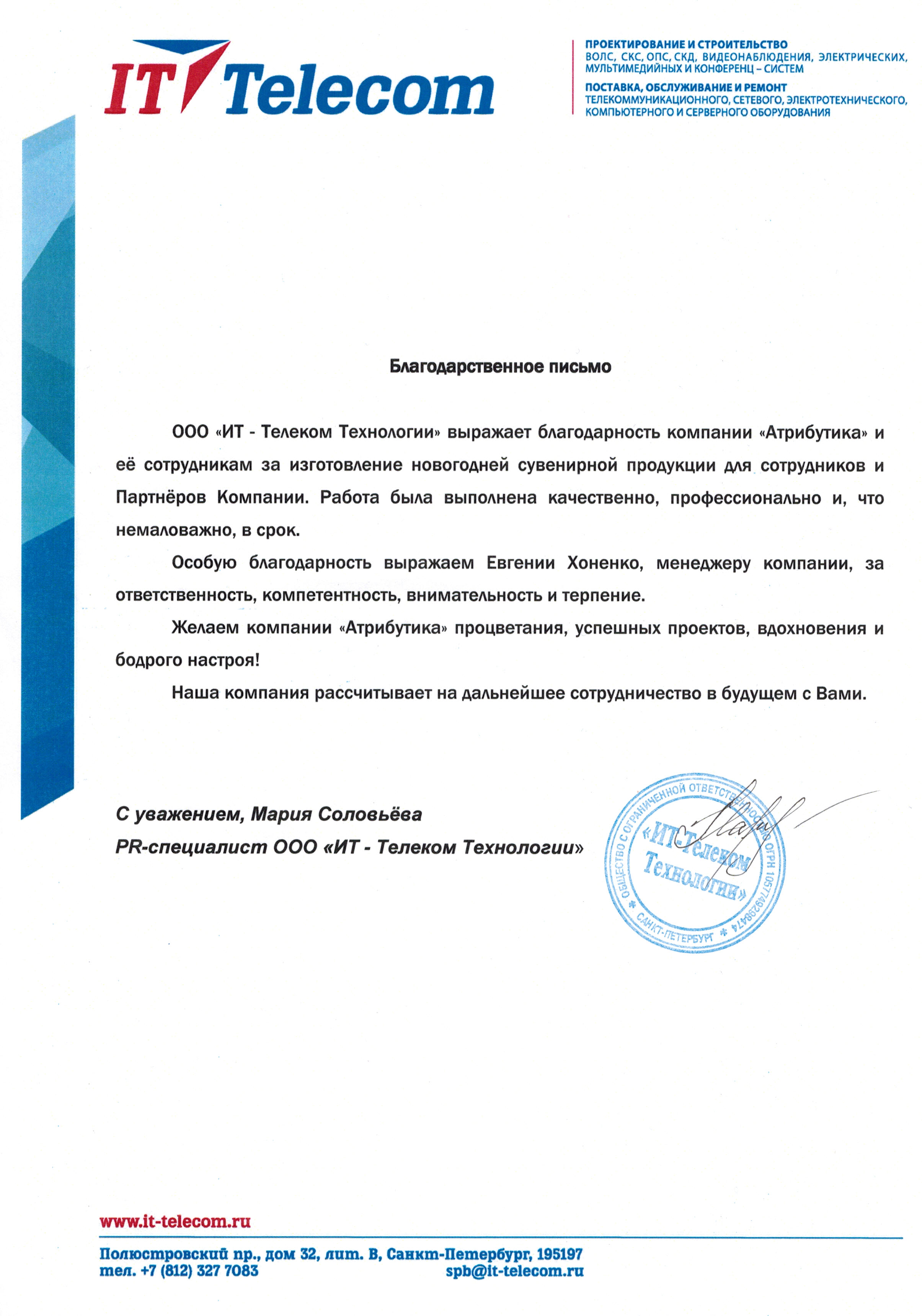 ООО «ИТ-Телеком Технологии» выражает благодарность компании «Атрибутика» и её сотрудникам за изготовление новогодней сувенирной продукции для сотрудников и Партнёром Компании. Работа была выполнена качественно, профессионально и, что немаловажно, в срок.