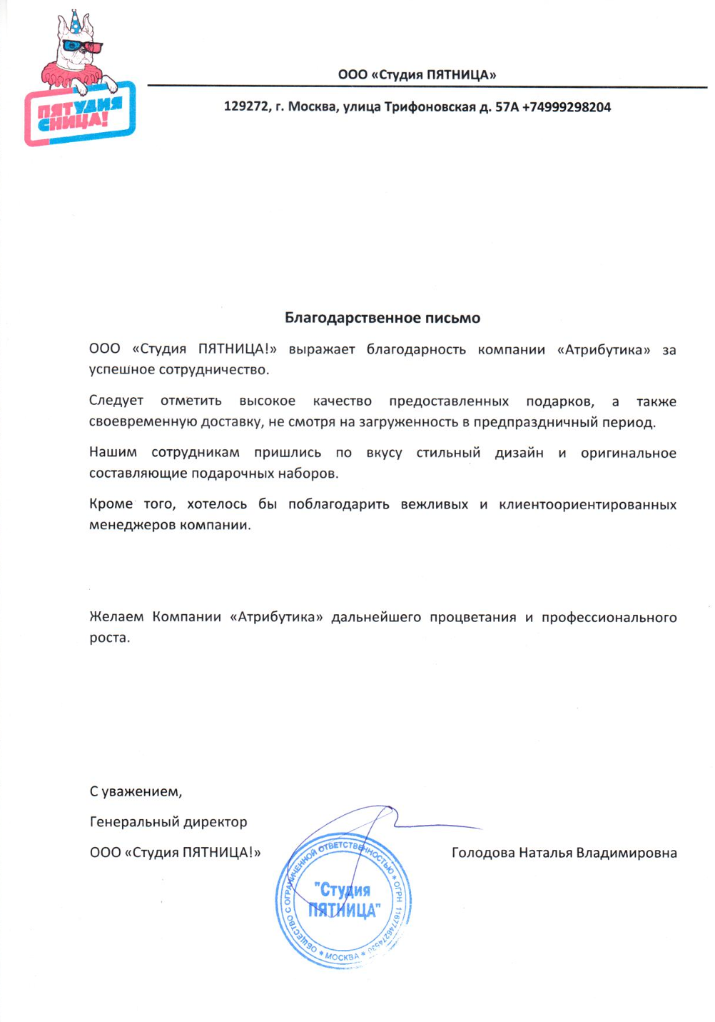 ООО «Студия ПЯТНИЦА!» выражает благодарность компании «Атрибутика» за успешное сотрудничество.