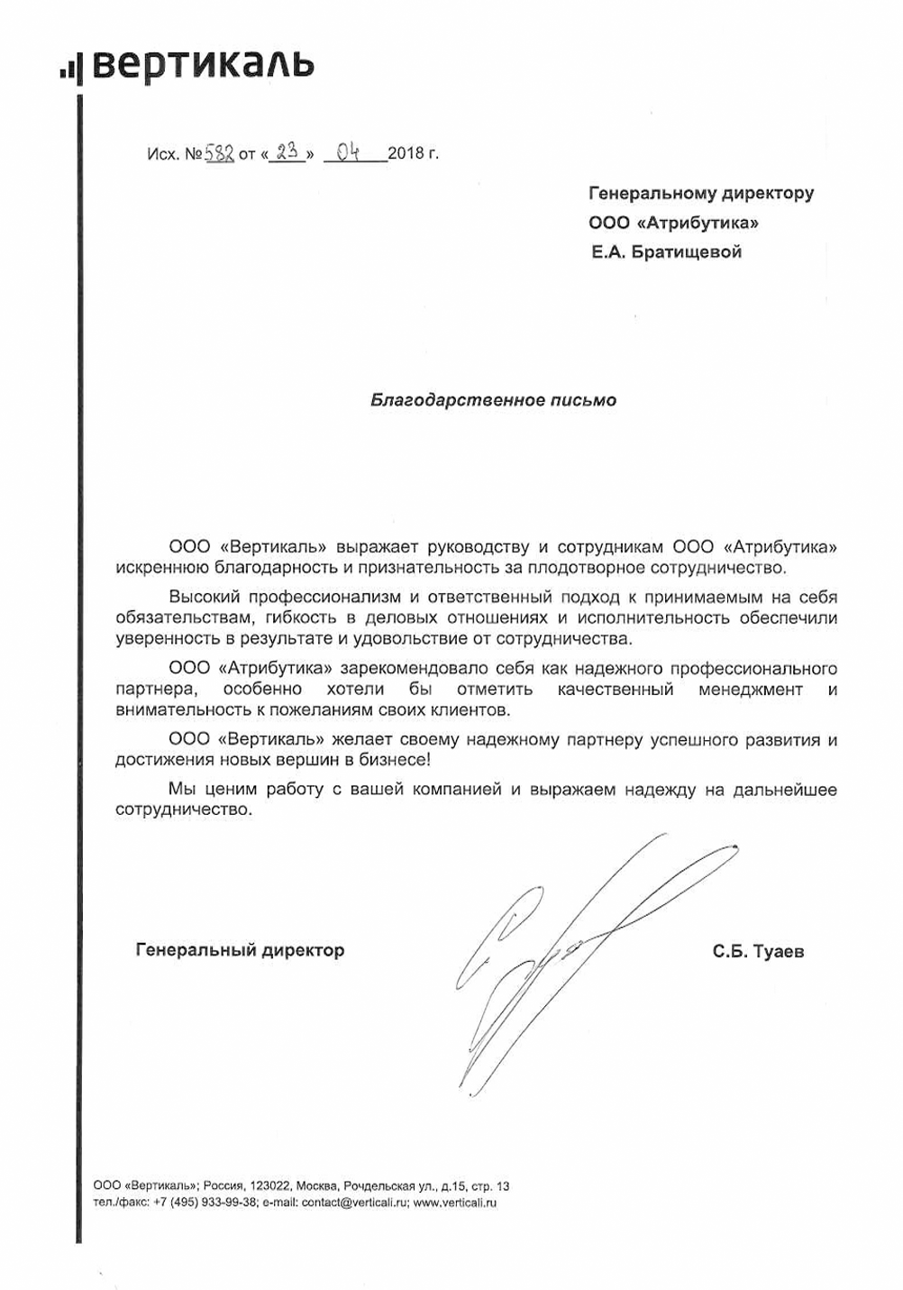 ООО «Вертикаль» выражает руководству и сотрудникам ООО «Атрибутика» искреннюю благодарность и признательность за плодотворное сотрудничество.